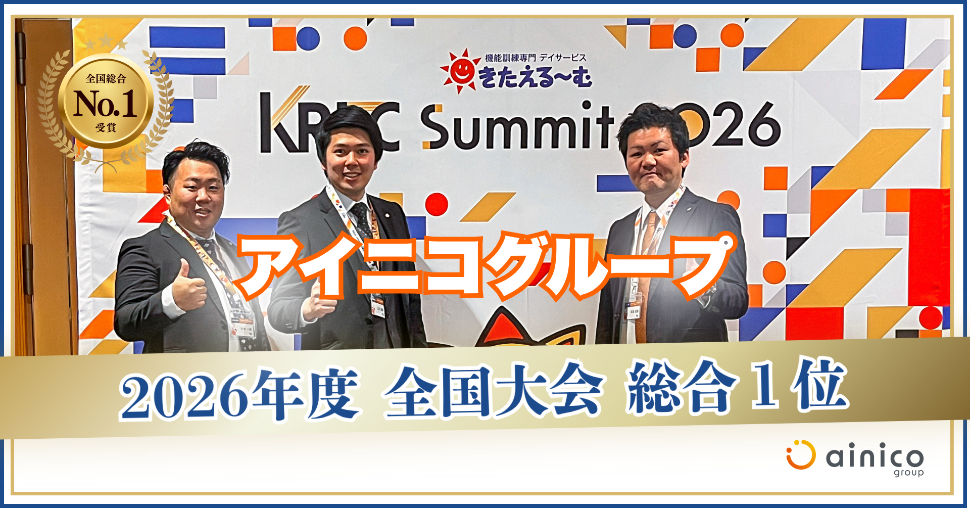 アイニコグループ株式会社(本社:奈良県奈良市、代表取締役:田尻忠義、以下「当社」)が運営する機能訓練専門デイサービス「きたえるーむ奈良帝塚山」は、2026年4月11日(土)、全国130店舗超が加盟する『きたえるーむ FC全国大会』(主催:株式会社ヤマチコーポレーション、会場:グランドメルキュール札幌大通公園)において、「総合1位」を2年連続で受賞いたしました。